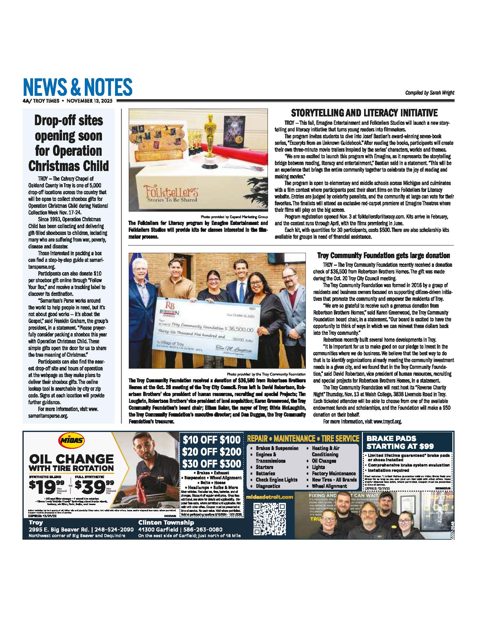 “It is important for us to make good on our pledge to invest in the communities where we do business. We believe that the best way to do that is to identify organizations already meeting the community investment needs in a given city, and we found that in the Troy Community Foundation,” said David W. Robertson, Vice President of Human Resources, Recruiting and Special Projects for Robertson Brothers Homes.