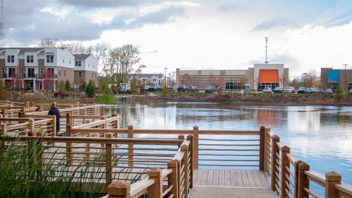 Opposite the commercial area, connected by the path around the pond are The Residences at Sakura Novi. Jim Clarke, CEO of Robertson Homes — the developer behind the 117 townhomes — said leasing began in February. The units are now at about 60% occupancy.